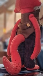This one-of-a-kind handmade Fox is dressed to pay respects in style. Featuring a tailored vest and pants, this dapper character exudes a quiet sophistication perfect for the somber occasion. The entire ensemble, from its earthy tones to the subtle textures, is crafted from upcycled materials, giving it a touch of rustic charm and sustainability.